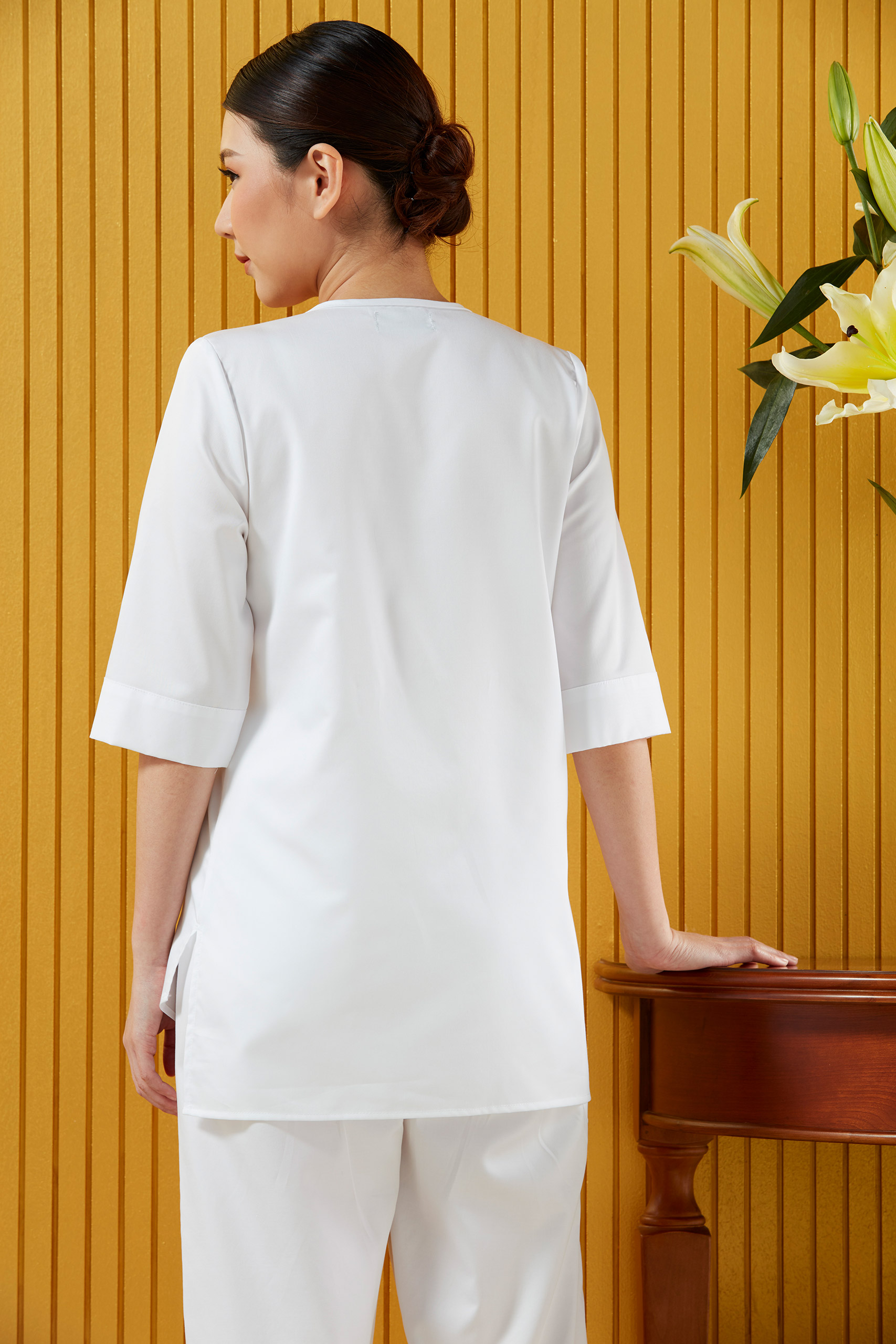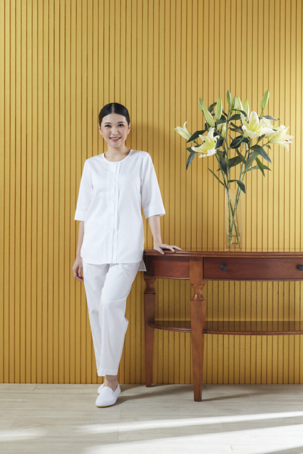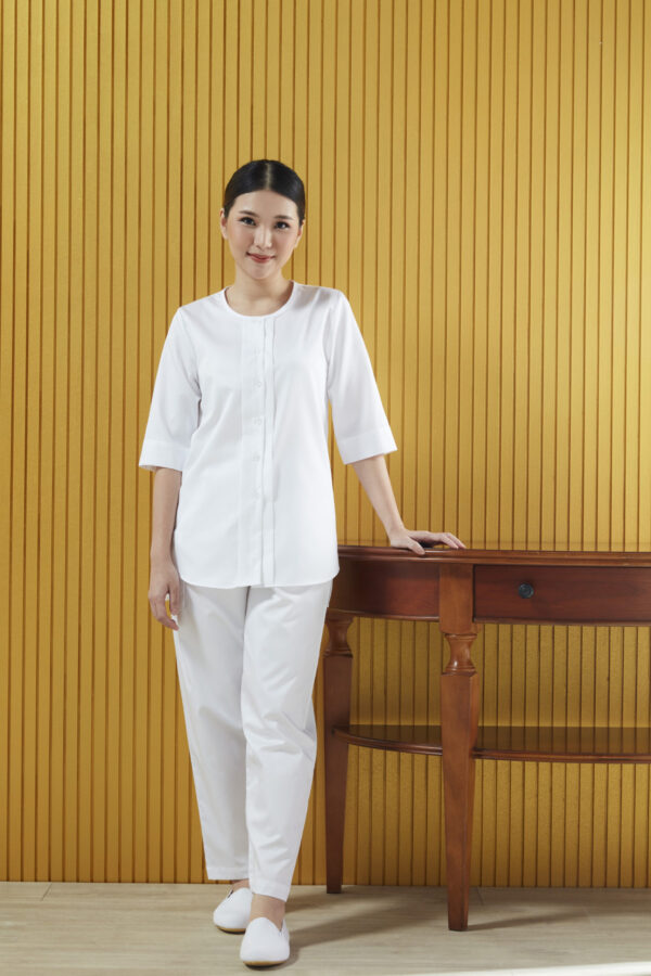 ใส่กับกางเกงสแลค กางเกงลำลองหลากสีได้ ใส่ได้ในทุกกิจ ทั้งปฏิบัติธรรม ใส่ทำงาน เที่ยว อยู่บ้าน ใส่ได้ไม่จำกัดกาล